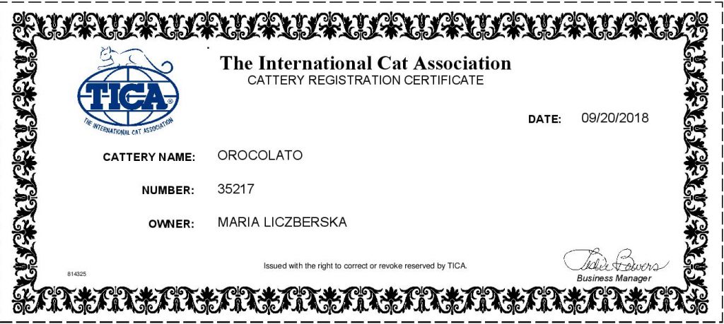 We are TICA and GCCF registered cattery. My cats have also GCCF/ GCCFI/ FIFE Pedigrees which are worldwide recognised.